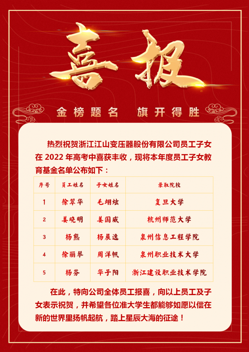 十年攻書寒苦,今宵征沖天路;回眸從前付出,潑墨卷袖書;恭祝,恭祝,此戰(zhàn)青云平步。浙江江山變壓器股份有限公司全體員工恭喜學(xué)子們金榜題名,在此衷心祝愿學(xué)子們在開學(xué)到來之際,學(xué)業(yè)有成,更上一層樓!